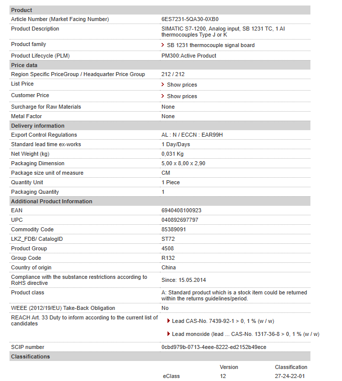 SIMATIC S7-1200, Analog input, SB 1231 TC, 1 AI thermocouples Type J or K