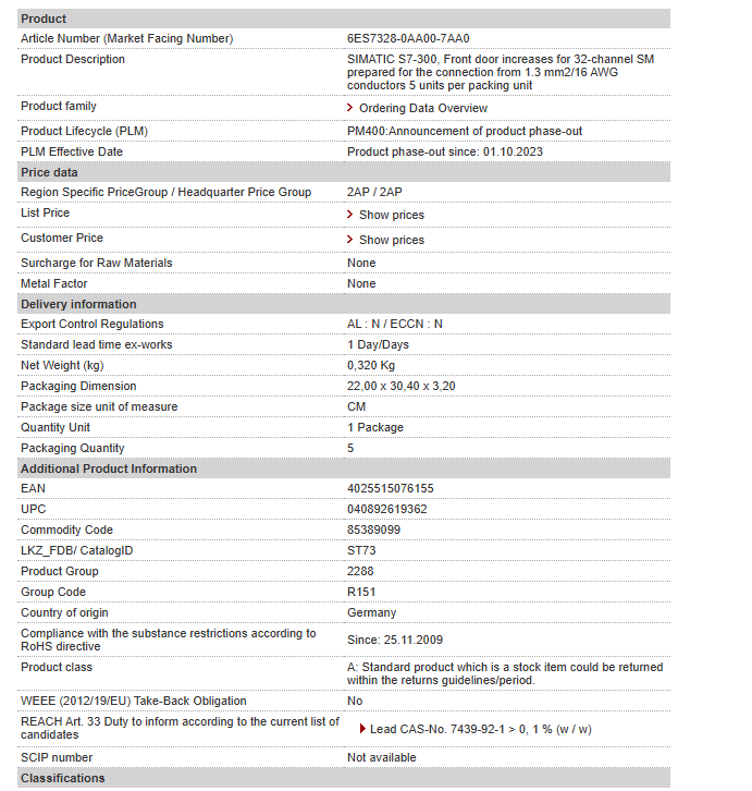 SIMATIC S7-300, Front door increases for 32-channel SM prepared for the connection from 1.3 mm2/16 AWG conductors 5 units per packing unit