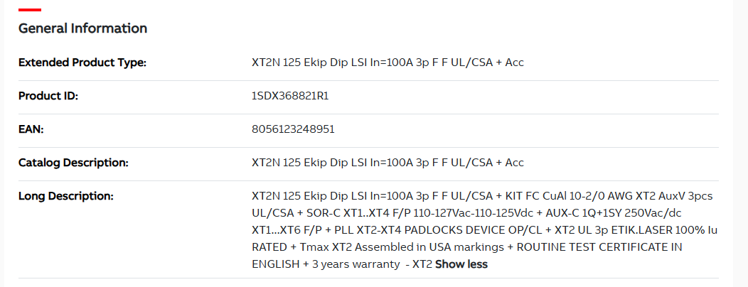 XT2N 125 Ekip Dip LSI In=100A 3p F F UL/CSA + Acc